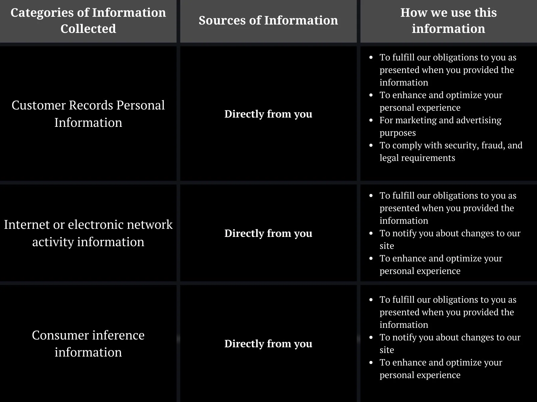 To help you better understand our practices, the chart below describes the categories of personal information collected, the sources of this information, how we use this information, and with which third parties we have shared this information within the past twelve months.